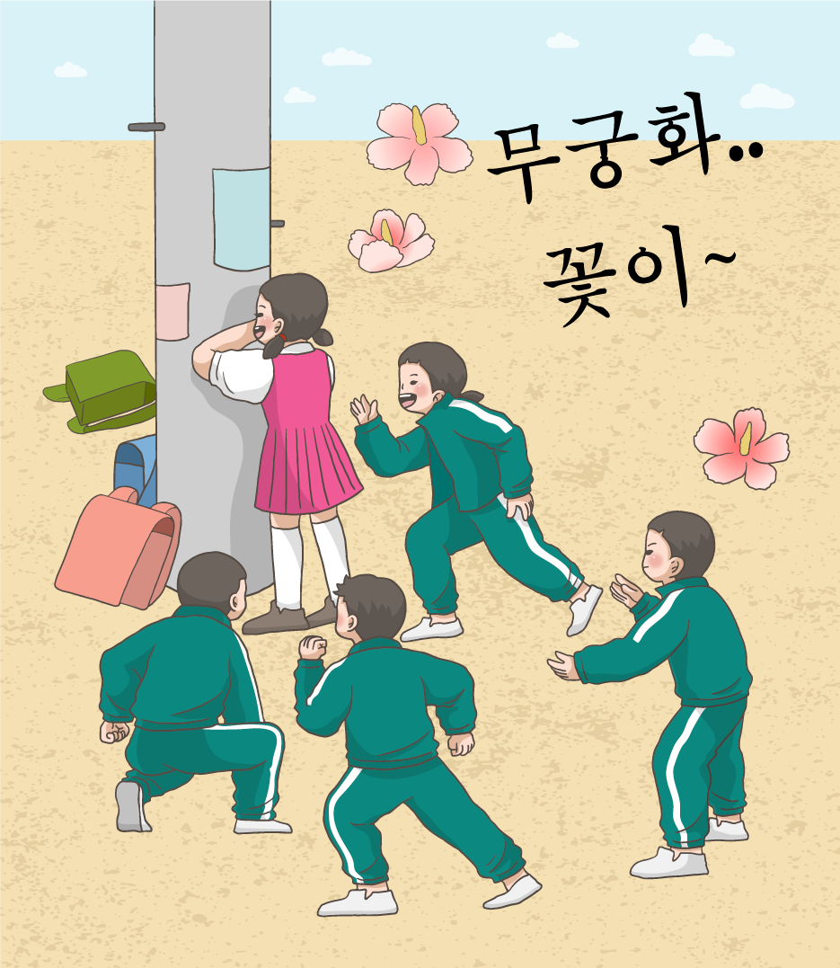 하지만 만약 누군가 술래에게 걸리지 않고 술래가 있는 곳에 이르러 술래를 건드리면 나머지 사람들은 원래 출발선까지 도망가고, 술래는 사람들을 쫒아가서 잡아야 합니다. 이 과정에서 잡히는 사람이 다음 차례의 술래가 되고, 아무도 잡히지 않을 경우 술래가 다시 한번 술래를 하게 됩니다. 사실 ‘무궁화 꽃이 피었습니다’는 우리나라에서만 존재하는 게임은 아닙니다. 이웃나라인 일본을 포함해서 미국, 중국, 그리고 서구권의 많은 나라에 비슷한 형태의 게임이 존재합니다. 어쩌면 ‘무궁화 꽃이 피었습니다’ 게임이 전 세계적으로 대중적인 놀이였다는 것이 <오징어 게임>의 흥행요소 중 하나였을 수도 있지 않을까요?